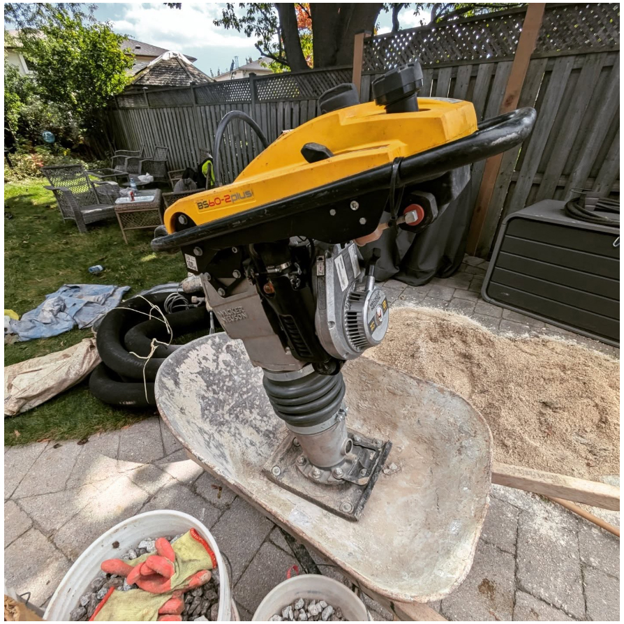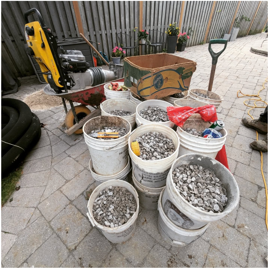 Replace weeping tile system within repair areas and cover with 6″ of 3/4″ clear gravel. Install fresh vertical drains in window wells and fasten new window wells to foundation walls. Cover new drains in window wells with 3/4″ clear gravel and level. Backfill and power tamp dirt.